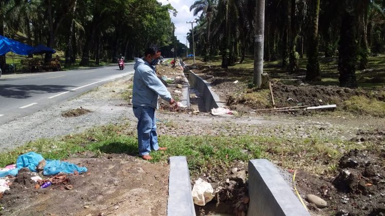 “Ada 6 jalan masuk kebun, saluran gorong-gorongnya tidak di buat sehingga aliran air tersumbat, inilah kendalanya nanti bila hujan turun air akan mengendap karena tidak mengalir dan akan meluap ke ruas jalan sehingga bisa mengakibatkan kerusakan parit pasangan sebab air masuk ke celah-celah pasangan dan mengakibatkan parit pasangan drainase roboh seperti yang saat ini terjadi,” ujarnya seraya berharap kepedulian dari perusahaan perkebunan untuk membangun gorong-gorong jalan agar saluran parit pasangan ini berfungsi.