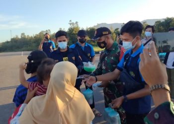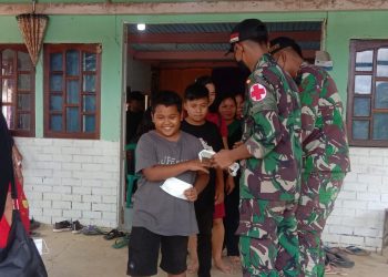KALBAR - MITRAPOLRI.COM Anggota Satgas Pamtas RI-Malaysia Yonif 144/JY bagikan Masker di Gereja GPSK Siloam desa Muakan Petinggi Kecamatan Ketungau...