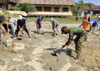 Kapuas Hulu, Kalbar - Mitrapolri.com Anggota Satgas Pamtas RI-Malaysia Yonif 144/JY melaksanakan Karya Bhakti Pengecoran jalan dan lapangan SMPN O1...