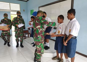 PAPUA - MITRAPOLRI.COM Prajurit TNI Satgas Pamtas RI-PNG Yonif 131/Brs Pos Ramil Tami membagikan seragam sekolah kepada pelajar SMPN 6...