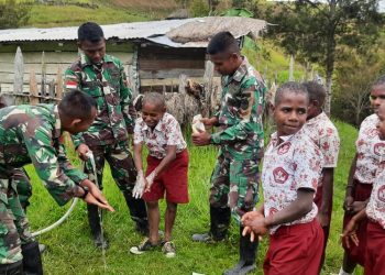PAPUA - MITRAPOLRI.COM Menanamkan pola hidup sehat sejak dini dilakukan oleh Prajurit Satgas Yonif MR 412 Kostrad dari Pos Malagay,...