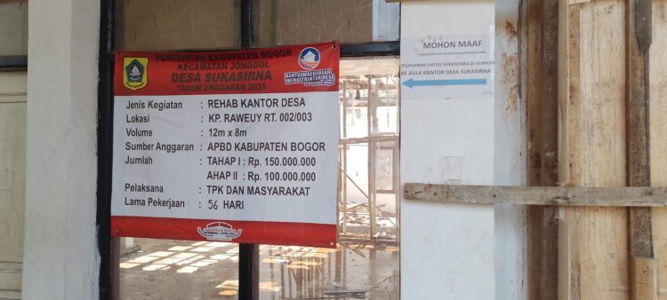 Pemerintah Kabupaten Bogor melalui Bantuan Keuangan Infrastruktur Desa yang lazim disebut APBD Kabupaten Bogor merealisasikan / mengucurkan Anggaran senilai Rp.250.000.000 – (Dua Ratus Lima Puluh Juta Rupiah) terhadap Pemerintahan Desa Sukasirna Kecamatan Jonggol. Hal ini segera direspon oleh Pemdes Sukasirna dengan Merehab Kantor Desa. Kantor Desa yang beralamat di Kp.Raweuy RT 002 / 003 ini merehab kantor 12 m X 8 m.