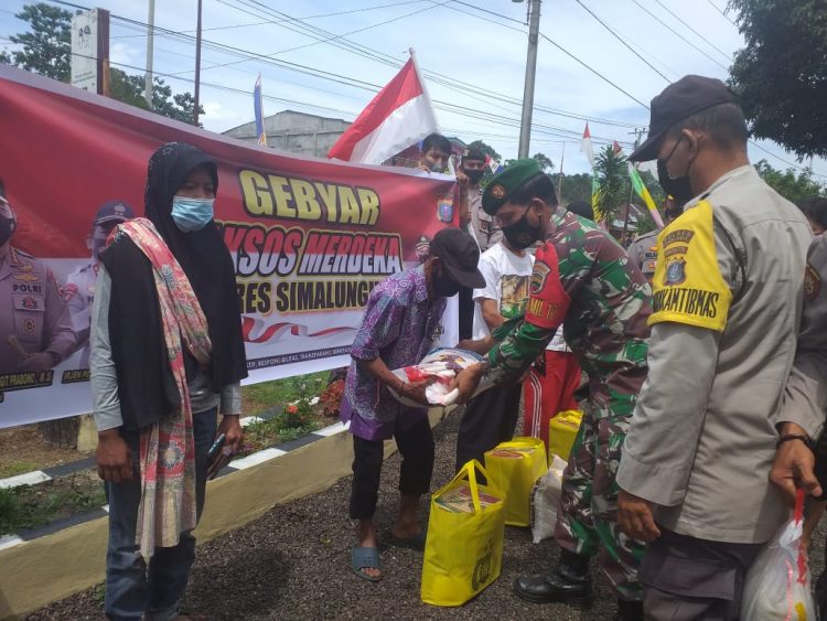 Kapolsek Tanah Jawa Kompol Selamat membagikan sembako kepada masyarakat yang kurang mampu, terkhusus kepada warga yang terdampak Covid 19 dan didampingi Danramil 10 Balimbingan Kapten CHB. BJ. Tampubolon. Jumat 20/08/2021 sekitar pukul 10.00 WIB.