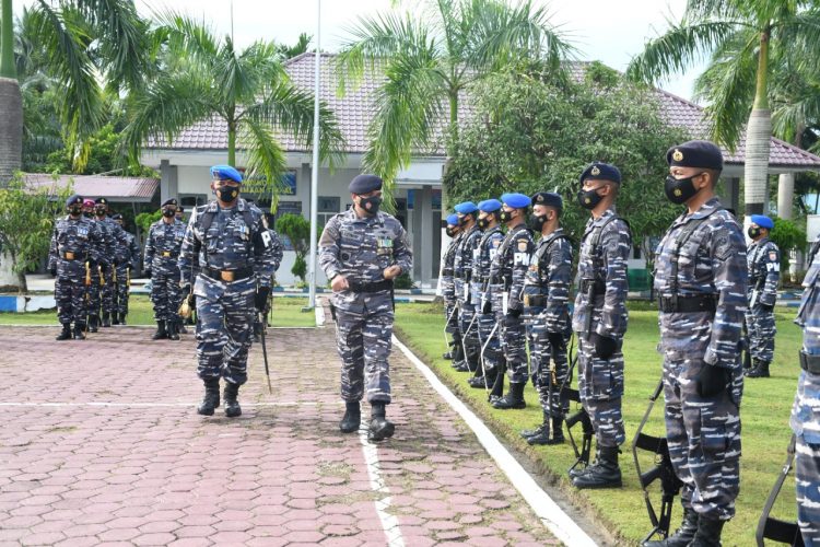 Tampak berbaris rapi prajurit Lanal TBA mengikuti upacara bersenjata dalam rangka memperingati Hari Armada Republik Indonesia Tahun 2021. Dengan tema, “Armada RI Ksatria Pengawal Samudera Untuk Indonesia Tumbuh, Indonesia Maju”.
