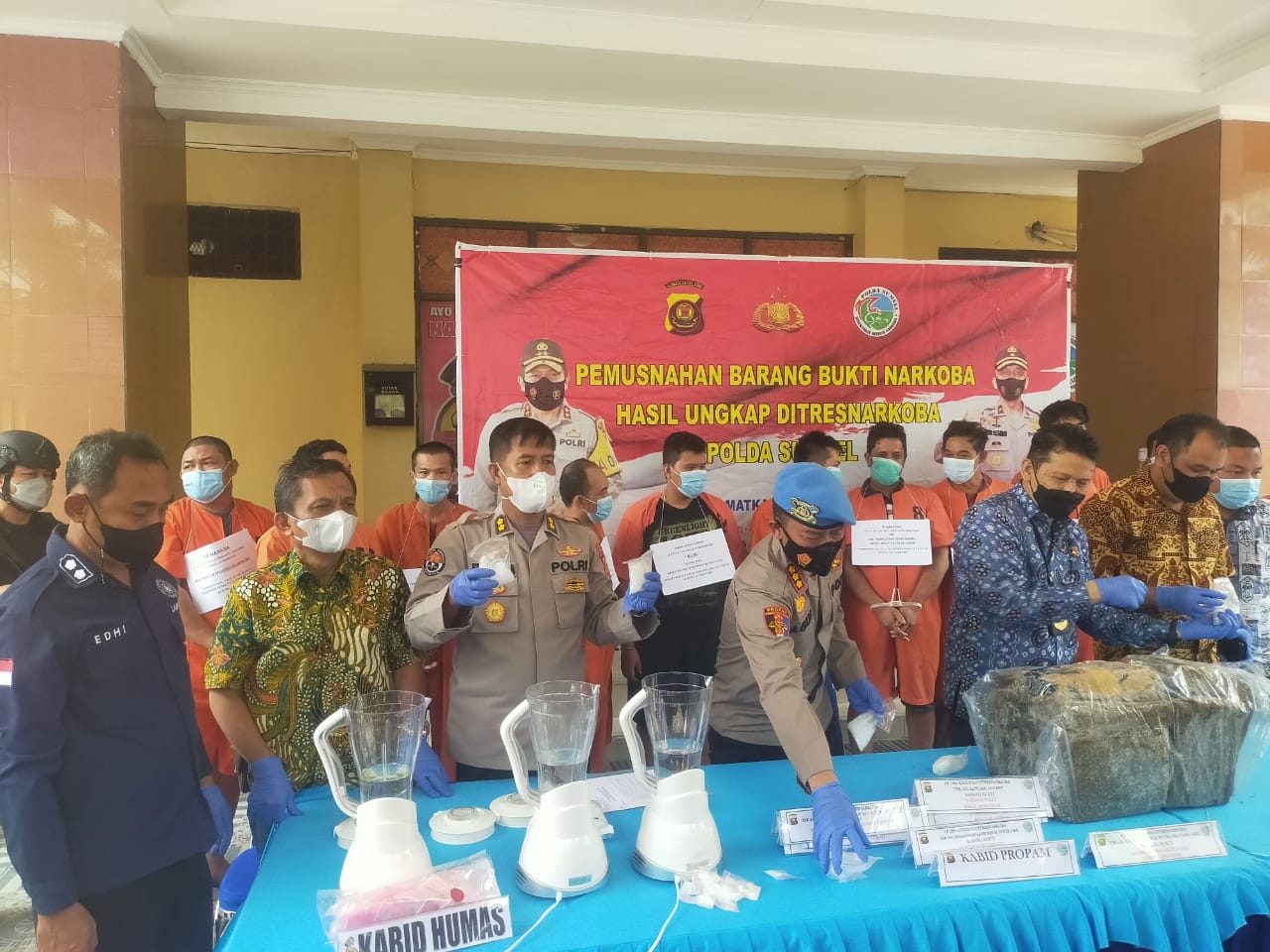 Sebelum dimusnahkan, barang bukti berupa sabu dan pil ekstasi, diambil contohnya dan kemudian dites menggunakan alat dari Labfor Polda Sumsel.