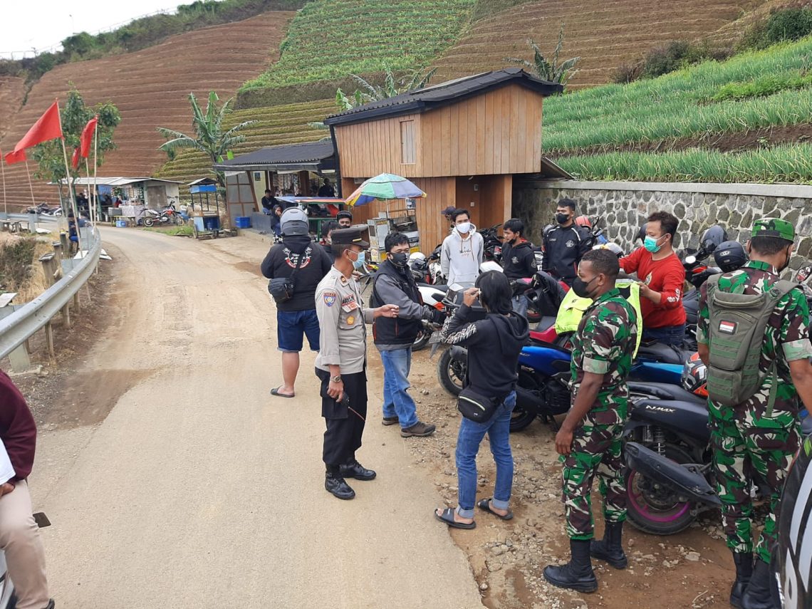 Koramil dan Polsek Argapura Polres Majalengka membagikan masker untuk warga yang tidak menggunakan masker di lokasi Obyek wisata Panyaweuyan, Pembagian masker ini dalam rangka pelaksanaan himbauan 5M di masa Pandemi Covid-19. Minggu (13/2/2022).