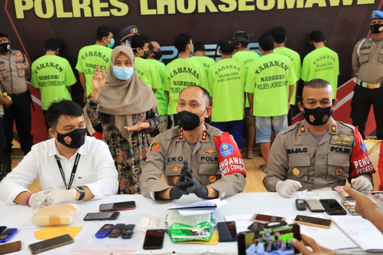 Kapolres Lhokseumawe AKBP Eko Hartanto SIK MH dalam konferensi pers di gedung serbaguna Wira Satya Mapolres Lhokseumawe, Senin (30/8/2021) kepada sejumlah awak media mengatakan, ke tiga tersangka ini berinisial, DS (37), S (25) dan MFI (26) warga Kecamatan Banda Sakti, Kota Lhokseumawe. Penangkapan tersebut berdasarkan Laporan Polisi (LP) 292/VIII/2021/Aceh/ Res. Lsmw, tanggal 23 Agustus 2021.